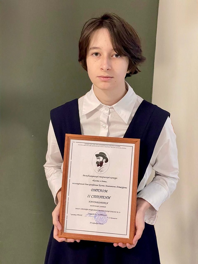 «В рамках празднования 166-й годовщины со дня рождения К.Л. Хетагурова во Дворце детского творчества прошёл республиканский конкурс рисунков "Коста и дети". Учащаяся 9 "Б" класса Моргоева Зарина награждена Дипломом II степени за работу "Мать сирот"»